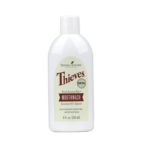 Thieves® Fresh Essence Plus Mouthwash blends Thieves, peppermint, spearmint, and vetiver essential oils for an extra clean mouth and fresh breath. It contains only natural ingredients and uses a patented, time-release technology for lasting freshness.